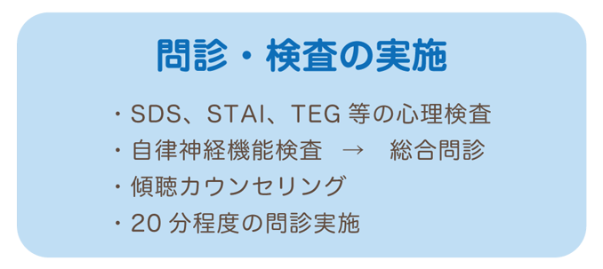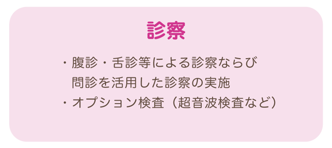 当院は、一般的な検査をし薬を処方して終了ではございません。 アンケート・総合問診・各種の検査機器を用いた根拠ある検査・診察を実施、 患者様の症状・お悩みに応じた様々な治療がご提案できます。